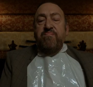 A badly wounded Hanzee Dent meets a man who provides him with documents for his new identity -- Moses Tripoli. Hanzee is referred to a "face man" who he is told will make "structural" changes to his face. When he is asked about his plans, he says he will start an empire of his own. When he is asked about his plans for revenge on the Kansas City mob, he starts speaking in the same manner that Tripoli did in the meeting in "Buridan's Ass": "Not apprehend, dead. Don't care 'heavily guarded', don't care 'Into the sea.'" He also defends a pair of boys, one of whom is deaf, from a pair of bullies (the boys, obviously, being Wrench and Numbers.)